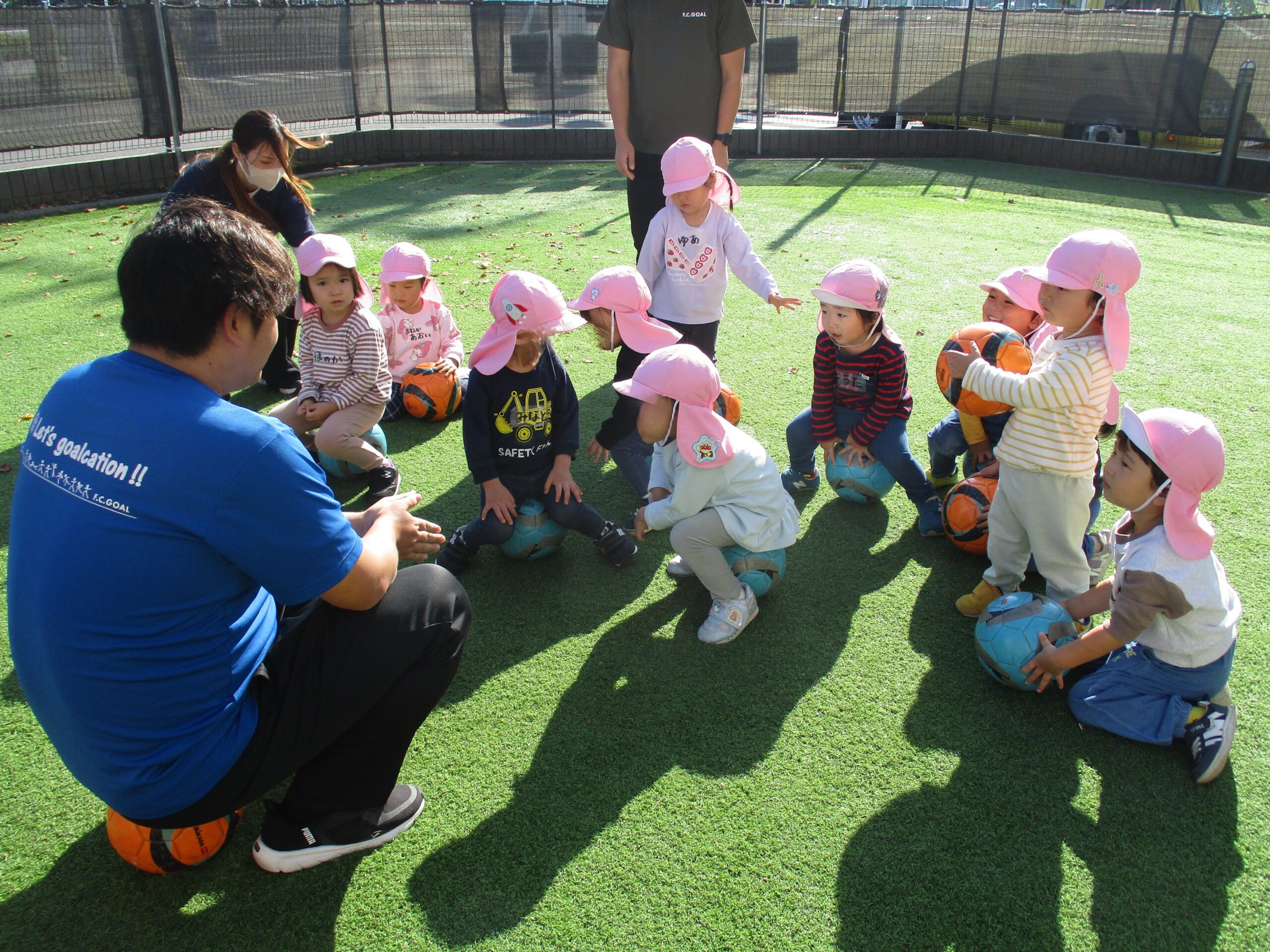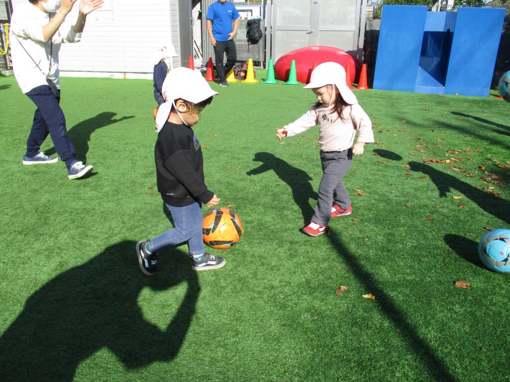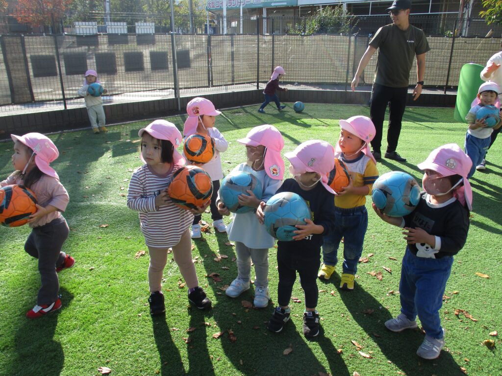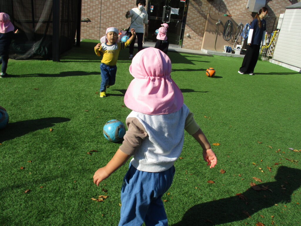11月7日㈮からつぼみ組でも運動遊びが始まりました。今までお兄さんお姉さんがやっているのを見ていたので、子どもたちも期待に胸をワクワクさせている様子でした。コーチに挨拶をして最初は仲良くなるために鬼ごっこ。コーチにタッチをして交流を深めました。その後、ボールに触れ蹴ったり投げたりして楽しく過ごす事が出来ました。まだまだ始まったばかりですが、これからの成長が楽しみです