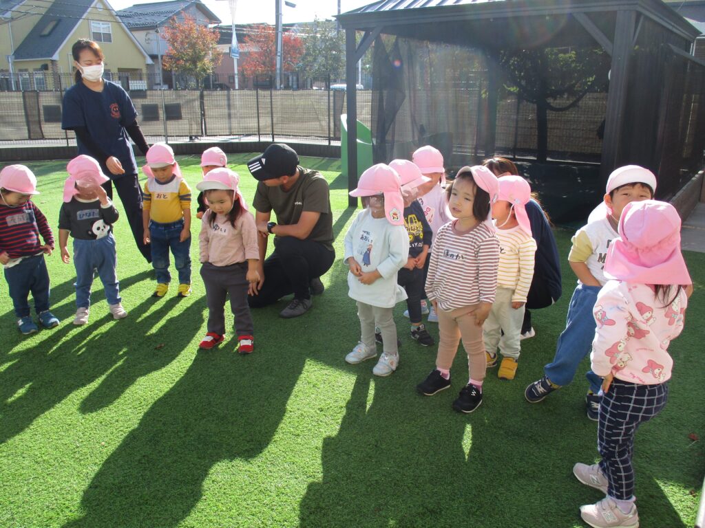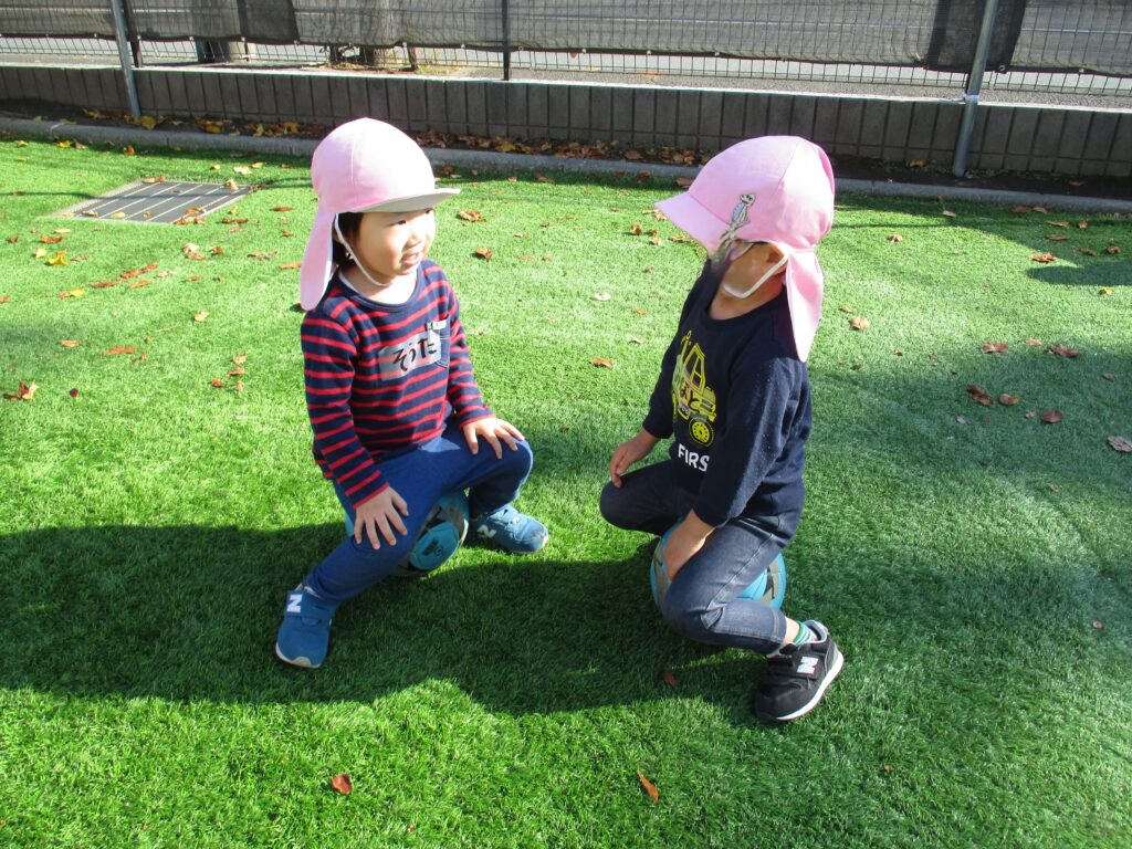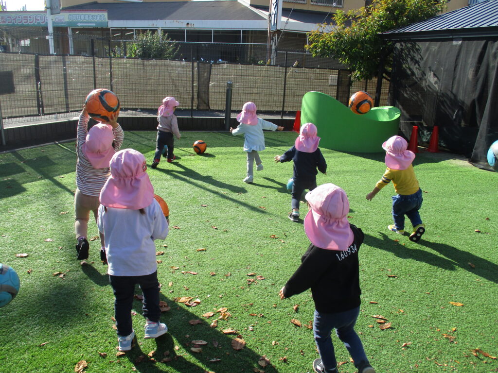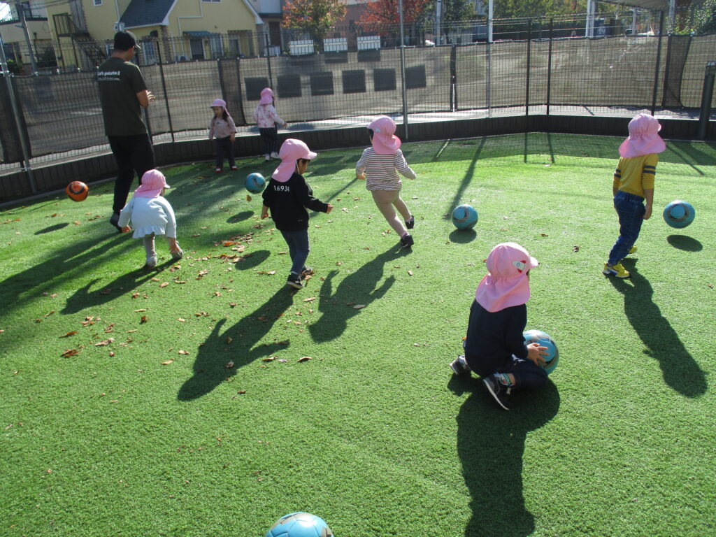 11月7日㈮からつぼみ組でも運動遊びが始まりました。今までお兄さんお姉さんがやっているのを見ていたので、子どもたちも期待に胸をワクワクさせている様子でした。コーチに挨拶をして最初は仲良くなるために鬼ごっこ。コーチにタッチをして交流を深めました。その後、ボールに触れ蹴ったり投げたりして楽しく過ごす事が出来ました。まだまだ始まったばかりですが、これからの成長が楽しみです