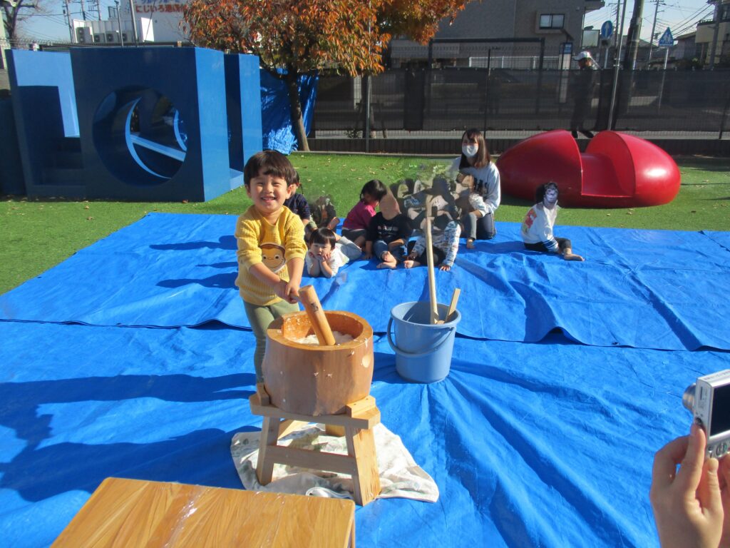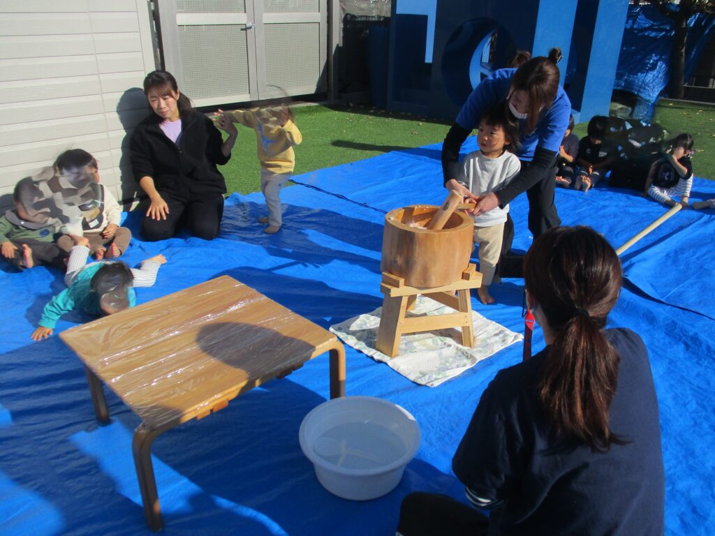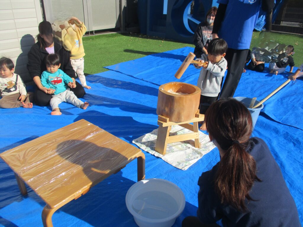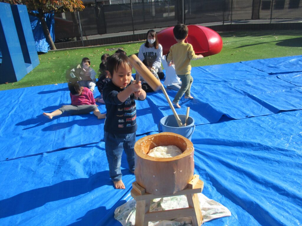 今日は毎年恒例のもちつきを行いました。1歳児クラスから年長児までそれぞれにもちつきを楽しみました。「よいしょ!よいしょ!」という掛け声を聞くと子どもたちもやる気が出てくるようで力いっぱいお餅をついていました。乳児クラス(1,2歳児)はお餅を触って感触を確かめます。幼児クラス(3,4,5歳児)は出来たお餅を食べる事が出来ないので鏡餅にして持ち帰ります。さてさて、どんな鏡餅が出来たのでしょうか…。お楽しみに♪