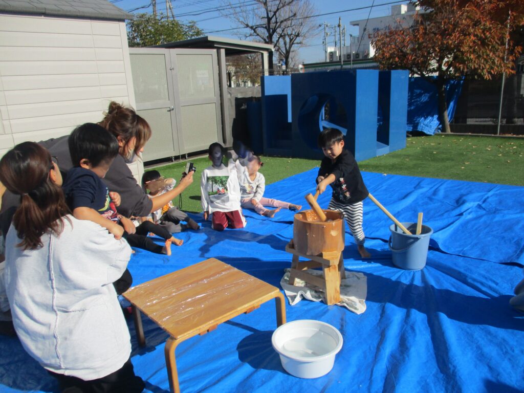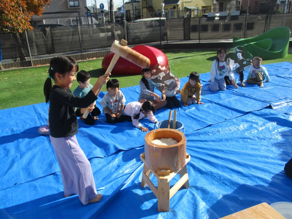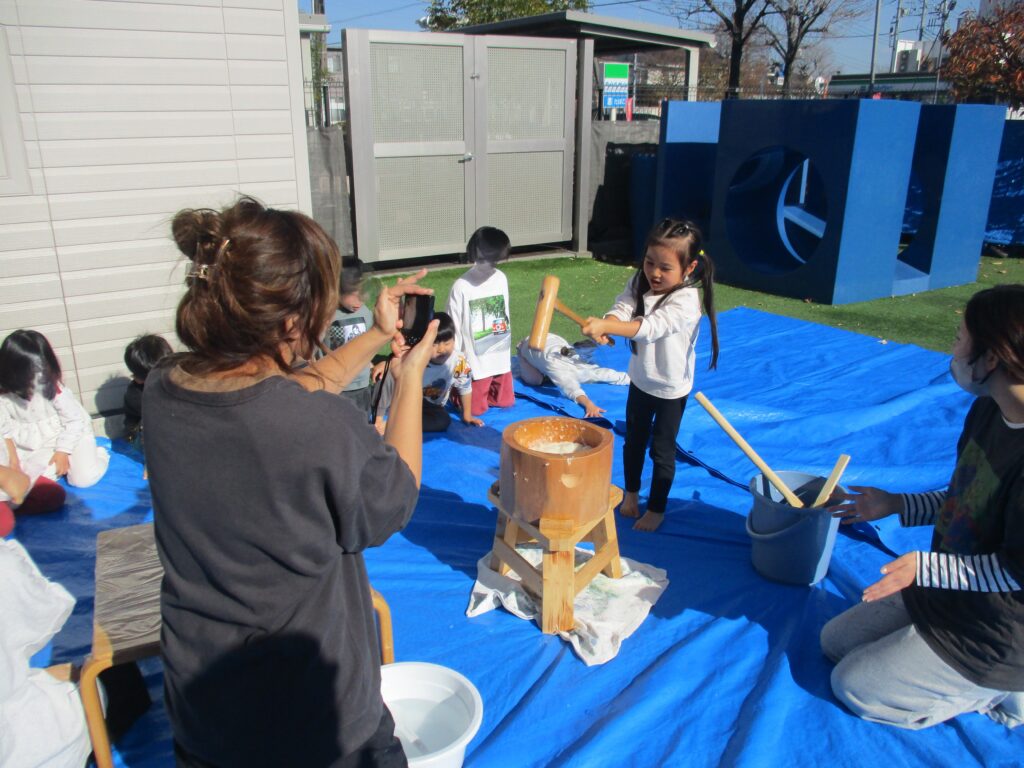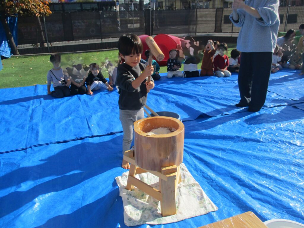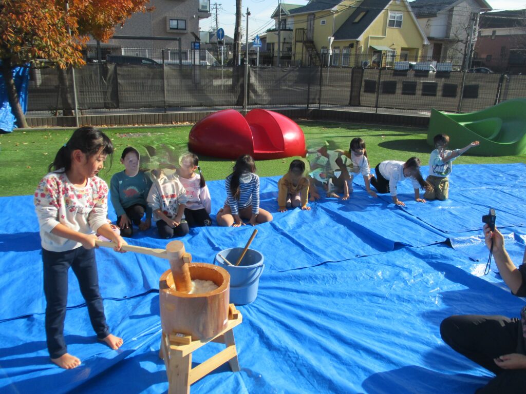 今日は毎年恒例のもちつきを行いました。1歳児クラスから年長児までそれぞれにもちつきを楽しみました。「よいしょ!よいしょ!」という掛け声を聞くと子どもたちもやる気が出てくるようで力いっぱいお餅をついていました。乳児クラス(1,2歳児)はお餅を触って感触を確かめます。幼児クラス(3,4,5歳児)は出来たお餅を食べる事が出来ないので鏡餅にして持ち帰ります。さてさて、どんな鏡餅が出来たのでしょうか…。お楽しみに♪