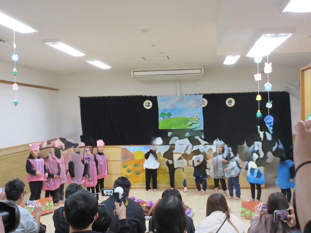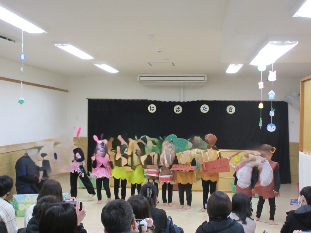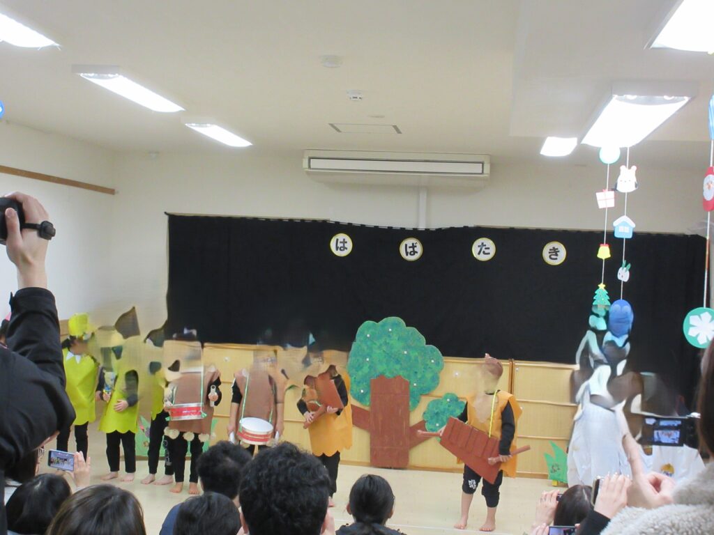 先日は生活発表会「はばたき」が行われました。無事に全員参加で行う事ができました。わかば組は保護者の方と一緒に「おべんとうバス」を、つぼみ組はハンドベル演奏と「バスがきました」の劇を、なのはな組は「いもいもほりほり」の劇を、さくらひまわり組は「いつまでもともだち」の劇を披露しました。子どもたちも緊張した面持ちでしたが、本番が始まると練習の何倍も上手に、そして楽しく参加していました。この一年間の子どもたちの成長を保護者の皆さんにお見せする事ができ、嬉しく思います。このクラスで過ごすのは残り3カ月となりました。各クラス進級に向け、毎日を楽しく元気に過ごせていければと思います。皆様のご協力、本当にありがとうございました。