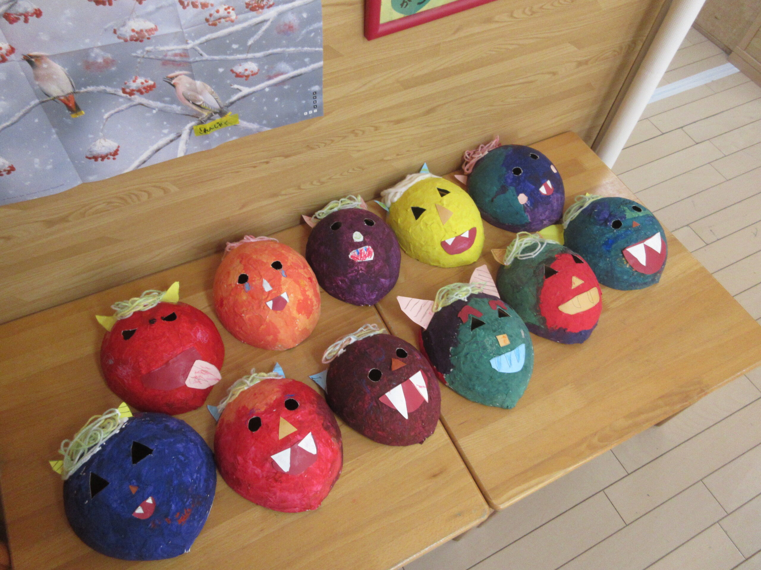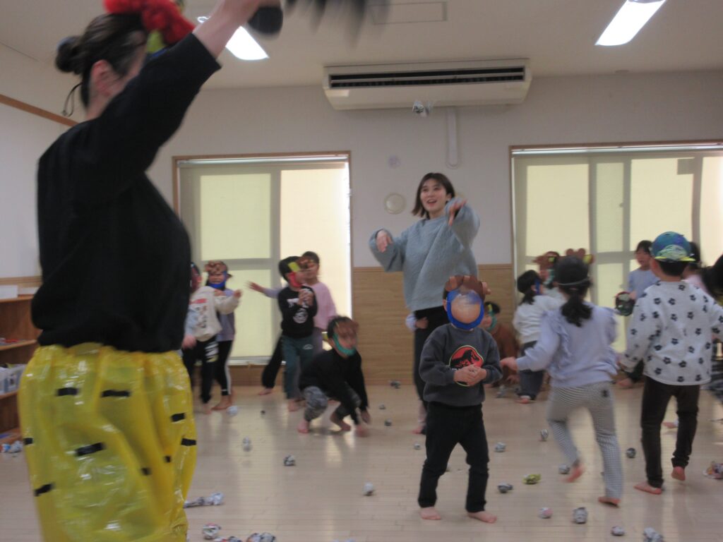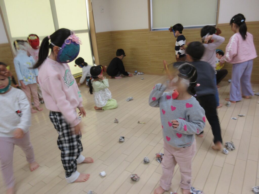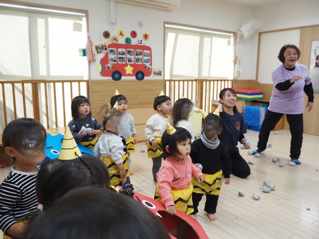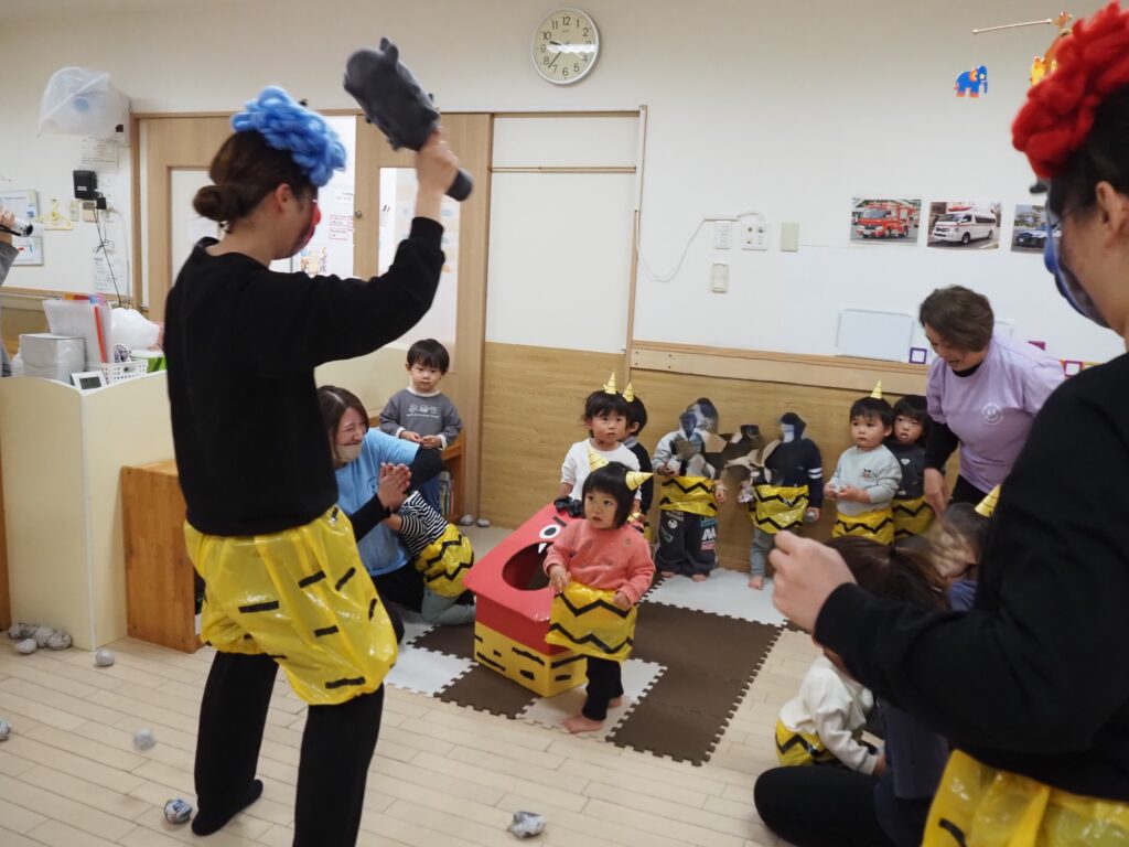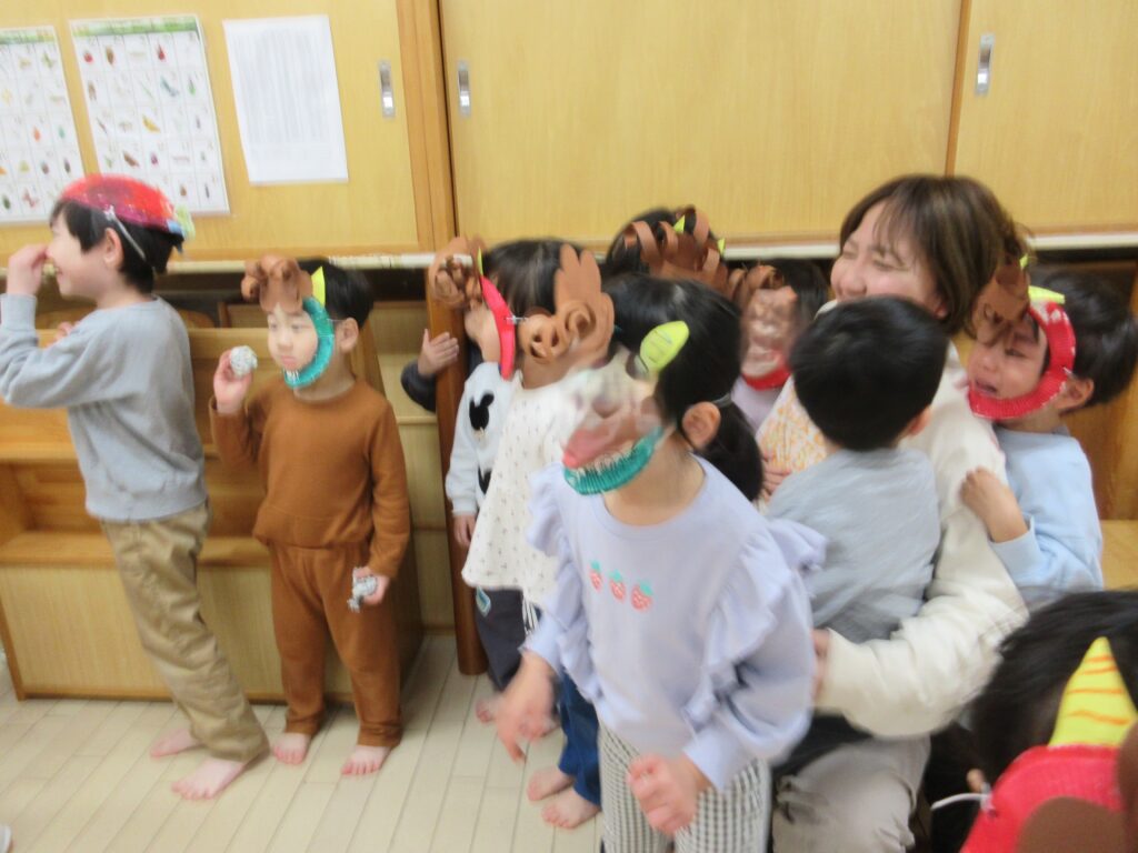 今日は節分。つばさ保育園にも毎年恒例の鬼がやってきました。来る前まではやる気満々で「鬼は外」と豆を投げる練習も張り切っていましたが、いざ鬼がやってくると立ち向かう子もいますが怖くて泣いてしまう子、保育者の後ろに隠れてしまう子、びっくりして呆然としてしまう子…と反応は様々でした。そしておやつには”おにまんじゅう”を食べ、鬼をやっつけました。