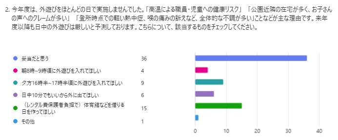 その他ご意見 「毎日暑く妥当だと思うが、外へ行ける日は外遊びを入れてほしい。」