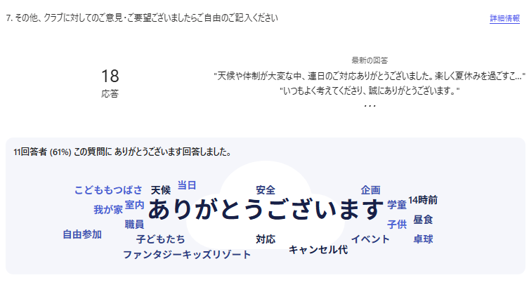 他、自由意見に18件いただきましたが、多くがクラブへの感謝のメッセージでしたので、割愛させていただきます。